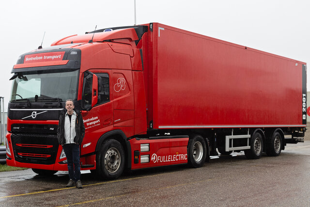 Gerrit Bosman voor een elektrische vrachtwagen van Bentvelzen Transport.