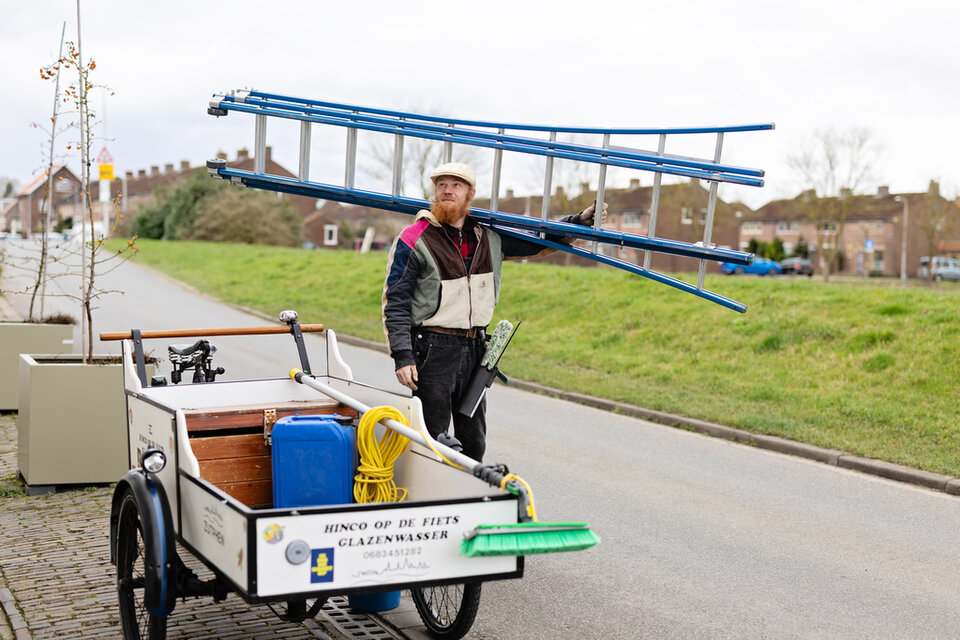 Met een antieke bakfiets gaat glazenwasser Hinco Woerdman langs zijn klanten