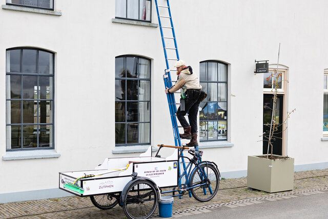 Hinco klimt op de ladder die aan zijn bakfiets bevestigd is, om de glazen van een van zijn klanten te wassen.